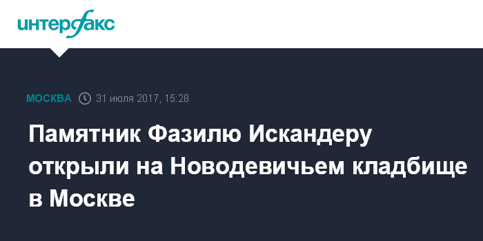 Москва. 31 июля. INTERFAX.RU - Памятник Фазилю Искандеру установлен на его могиле на Новодевичьем кладбище в Москве в день годовщины смерти писателя, передает корреспондент "Интерфакса".