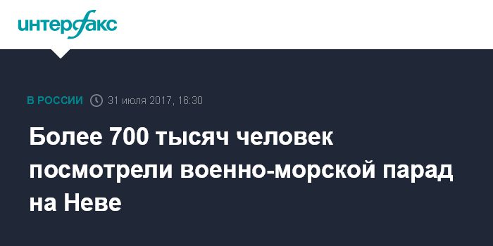 Москва. 31 июля. INTERFAX.RU - Главный военно-морской парад России, прошедший в Санкт-Петербурге в воскресенье, посетили более 700 тысяч человек.
