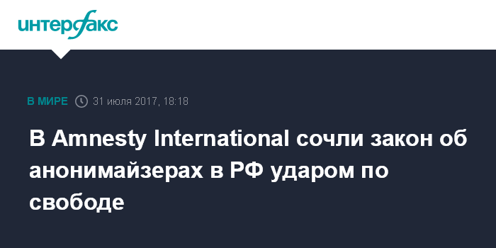 Москва. 31 июля. INTERFAX.RU - Подписанный президентом России закон о запрете анонимайзеров и виртуальных частных сетей (VPN) является серьезным ударом по свободе Интернета в России, заявили в Amnesty International.