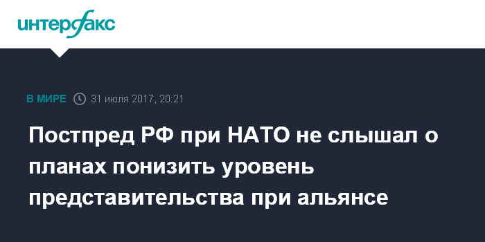 Москва. 31 июля. INTERFAX.RU - Постпред России при НАТО Александр Грушко не знает о возможном понижении уровня представительства России в диалоге с Североатлантическим альянсом.