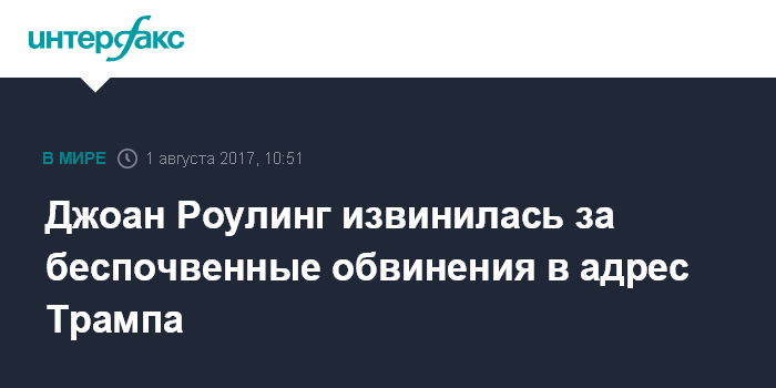 Москва. 1 августа. INTERFAX.RU - Британская писательница Джоан Роулинг извинилась за недавнюю критику в адрес президента США Дональда Трампа, признав, что ее обвинения были основаны не ложной информации.