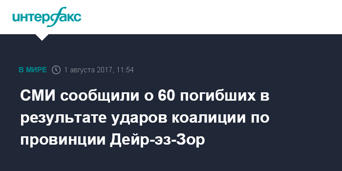 Москва. 1 августа. INTERFAX.RU - Агентство САНА сообщило во вторник, что 60 человек погибли в результате авиаударов возглавляемой США международной коалиции по восточным районам сирийской провинции Дейр-эз-Зор.