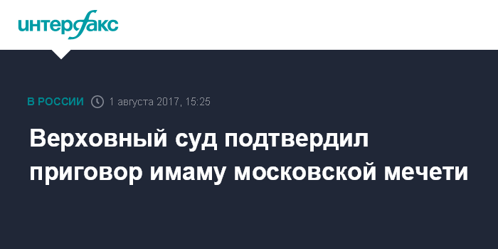 Москва. 1 августа. INTERFAX.RU - Верховный суд РФ признал законным приговор имаму столичной мечети "Ярдям" Махмуду Велитову по делу о публичном оправдании терроризма, передаtт во вторник корреспондент "Интерфакса".