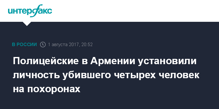 Москва. 1 августа. INTERFAX.RU - Полицейские в Армении установили личность человека, устроившего стрельбу на траурной церемонии в Арагацотнской области, жертвами которой стали четыре человека, сообщил "Интерфаксу" во вторник начальник пресс-службы полиции республики Эдгар Джаноян.