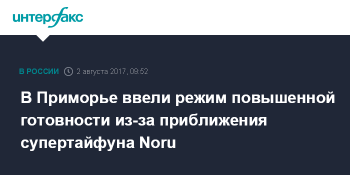Москва. 2 августа. INTERFAX.RU - Режим повышенной готовности объявлен в Приморье в связи с возможным наступлением тайфуна Noru на регион в начале следующей недели.