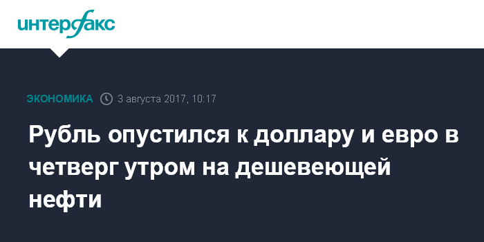 Как отмечают эксперты "Интерфакс-ЦЭА", рубль слабеет к доллару и евро на старте торгов четверга на фоне дешевеющей нефти после роста накануне, так как инвесторы обеспокоены недостаточно быстрым сокращением запасов и продолжающимся ростом объемов добычи в США. Цена октябрьских фьючерсов на нефть Brent на лондонской бирже ICE Futures к 10:00 мск уменьшилась на 0,55% - до $52,07 за баррель. Нефть WTI с поставкой в сентябре на электронных торгах Нью-йоркской товарной биржи (NYMEX) опустилась на 0,58% - до $49,3 за баррель.