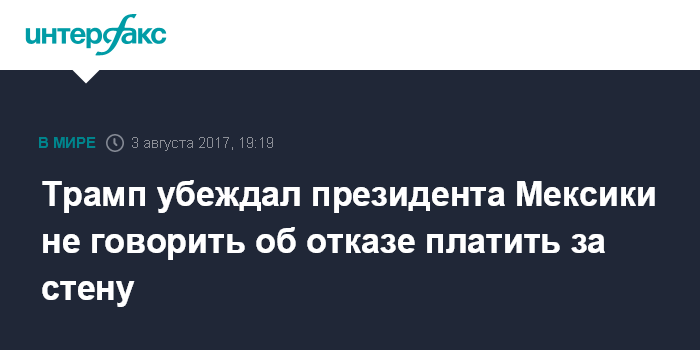 Москва. 3 августа. INTERFAX.RU - Президент США Дональд Трамп в январе уговаривал своего мексиканского коллегу Энрике Пенью Ньето перестать заявлять, что его страна не собирается платить за стену на границе Мексики и США.