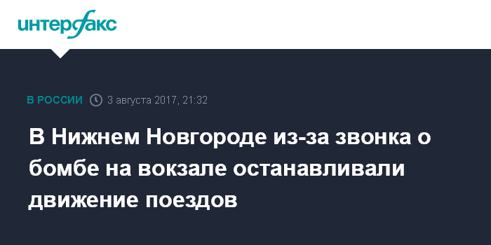 Москва. 31 июля. INTERFAX.RU - Несколько поездов в четверг вечером не смогли вовремя отправиться с железнодорожного вокзала в Нижнем Новгороде из-за анонимного звонка о якобы заложенной бомбе.