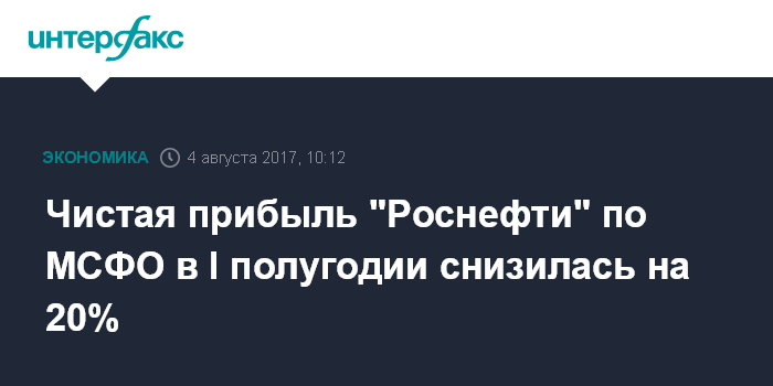 Москва. 4 августа. INTERFAX.RU - Чистая прибыль "Роснефти" по МСФО в первом полугодии 2017 года составила 81 млрд рублей, что на 20% ниже показателя за аналогичный период прошлого года, следует из сообщения компании.