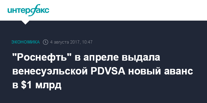 Москва. 4 августа. INTERFAX.RU - "Роснефть" в апреле 2017 года в рамках контракта на поставку нефти выдала венесуэльской PDVSA новый аванс в сумме $1,015 млрд, следует из отчета российской компании по МСФО. В течение 2016 года компания выдавала PDVSA несколько авансов: в мае $500 млн, в ноябре два аванса на $500 млн и $205 млн, в декабре $280 млн.