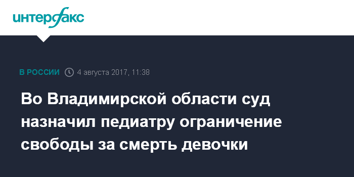 Москва. 4 августа. INTERFAX.RU - Муромский городской суд Владимирской области вынес приговор бывшему врачу-педиатру городской станции скорой медицинской помощи Жанне Стрелковой по делу о смерти трехлетней девочки, сообщает пресс-служба регионального СУ СКР. Ей назначено наказание в виде полутора лет ограничения свободы и запрета заниматься врачебной деятельностью в течение года.