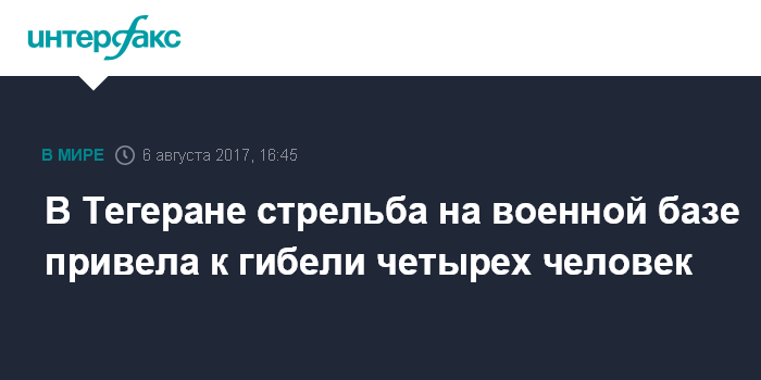 Москва. 6 августа. INTERFAX.RU - Один из иранских военнослужащих открыл огонь по своим сослуживцам на военной базе на южной окраине столицы, в результате четыре солдата погибли, восемь получили ранения, сообщают СМИ со ссылкой на заявление военного командования.