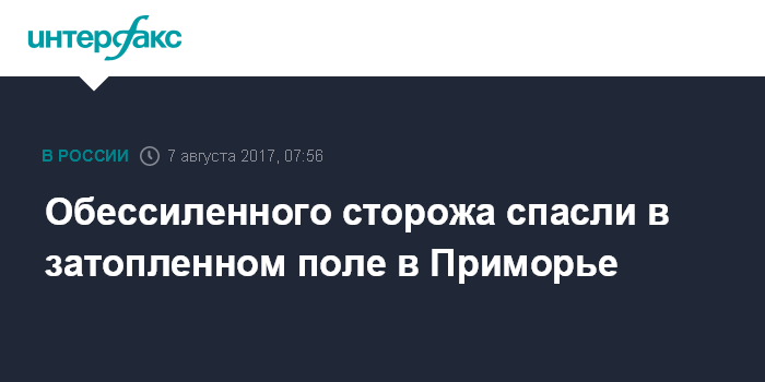 Москва. 7 августа. INTERFAX.RU - Специалисты Приморской краевой поисково-спасательной службы в понедельник во время разведки близ поселка Оленевод помогли сторожу - жителю села Раздольное. Как сообщает пресс-служба Государственного казенного учреждения ГО и ЧС по Приморью, информация о том, что в сторожке в затопленном поле в Надеждинском районе находится человек, вовремя поступила специалистам.