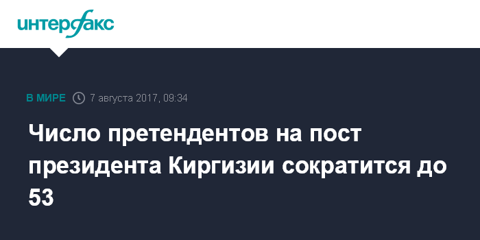 Согласно данным ЦИК Киргизии, пока на должность президента республики претендуют 56 человек. Регистрация кандидатов завершится 15 сентября. Шестилетний президентский срок действующего главы государства Алмазбека Атамбаева истекает 1 декабря. Согласно Конституции страны, он не имеет права повторно баллотироваться.