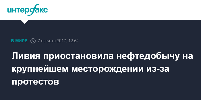 Москва. 7 августа. INTERFAX.RU - Добыча нефти на крупнейшем ливийском месторождении аш-Шарара приостановлена в связи с забастовкой рабочих, сообщают Bloomberg и Reuters со ссылками на информированные источники.