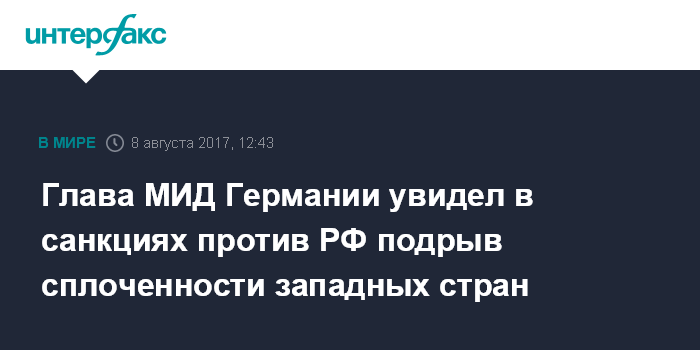 "Для нас, так называемого Запада, очень важно держаться вместе. Закон о санкциях (против России - ИФ), который был принят Конгрессом США, скорее вредит этому", - сказал министр в интервью немецкой газете Westfälische Nachrichten.