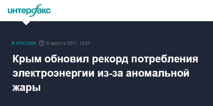 Москва. 8 августа. INTERFAX.RU - Крымский полуостров ставит рекорды потребления электроэнергии из-за 40-градусной жары, сообщили во вторник в Минэнерго РФ.