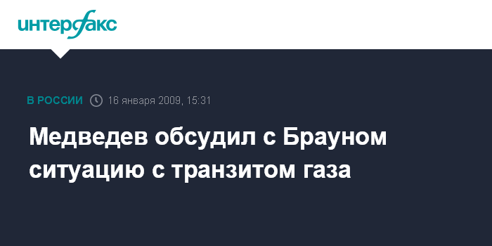 Москва. 16 января. INTERFAX.RU - Вопросы, касающиеся ситуации с транзитом в Европу российского газа через территорию Украины, обсудили президент России Дмитрий Медведев и премьер Великобритании Гордон Браун.