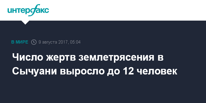 Москва. 9 августа. INTERFAX.RU - По поступающим от китайских властей сведениям, число жертв землетрясения в юго-западной провинции Сычуань выросло до 12 человек, пострадавших - до 175 человек, сообщают местные СМИ.