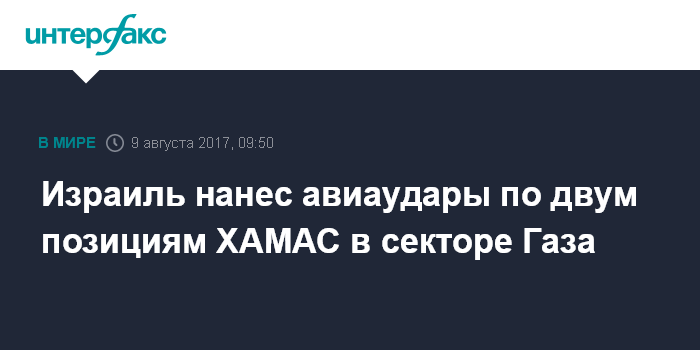 Москва. 9 августа. INTERFAX.RU - ВВС Израиля нанесли несколько авиаударов по двум позициям боевиков палестинского движения ХАМАС на севере сектора Газа в ответ на ракетный обстрел израильской территории. Об этом сообщает в среду агентство Associated Press.