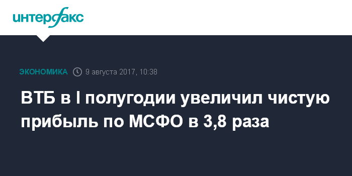 Москва. 9 августа. INTERFAX.RU - Москва. 9 августа. ИНТЕРФАКС - ВТБ в первом полугодии 2017 года увеличил чистую прибыль по МСФО в 3,8 раза - до 57,9 млрд рублей по сравнению с 15,4 млрд рублей за тот же период прошлого года, говорится в отчетности группы.