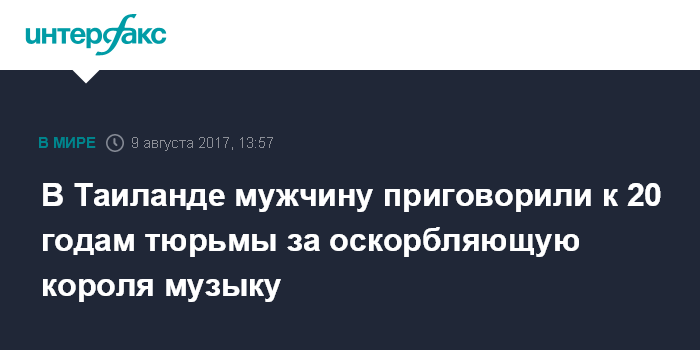 Москва. 9 августа. INTERFAX.RU - Подданного Таиланда приговорили к 20 годам тюремного заключения за размещение в интернете музыкальных записей, тексты которых оскорбляли членов королевской семьи этой страны, сообщают в среду западные СМИ.
