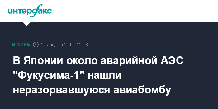 Москва. 10 августа. INTERFAX.RU - В Японии в 300 метрах от аварийной атомной электростанции "Фукусима-1" обнаружили неразорвавшуюся авиабомбу, сброшенную авиацией США во время Второй мировой войны, сообщает в четверг агентство "Дзидзи".