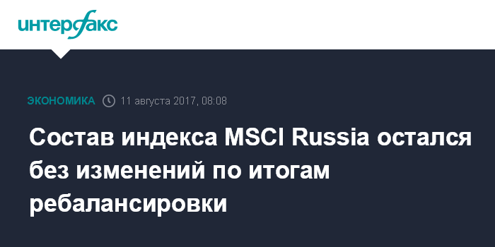 Москва. 11 августа. INTERFAX.RU - Состав индекса MSCI Russia остался без изменений по итогам очередной квартальной ребалансировки, как и ожидалось, сообщил агентству "Интерфакс" стратег "ВТБ Капитала" Илья Питерский.