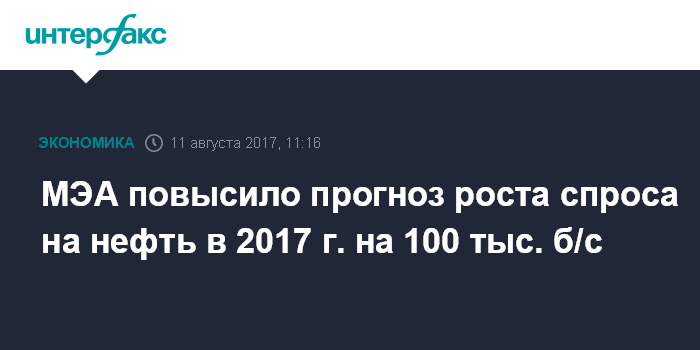 Москва. 11 августа. INTERFAX.RU - Международное энергетическое агентство (МЭА) повысило прогноз роста спроса на нефть в 2017 году на 100 тыс. б/с - до 97,6 млн б/с. Об этом сообщает агентство Bloomberg со ссылкой на отчет.