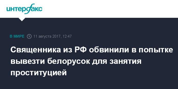 Москва. 11 августа. INTERFAX.RU - Следственный комитет предъявил обвинение российскому священнику, который пытался вывезти двух белорусок в Санкт-Петербург для занятия проституцией.
