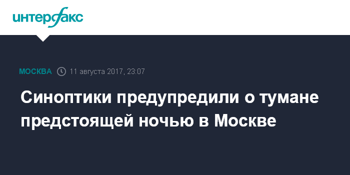 Москва. 11 августа. INTERFAX.RU - Туман ожидается в Москве в ближайший час с сохранением до утра субботы, сообщили "Интерфаксу" в столичном главке МЧС.