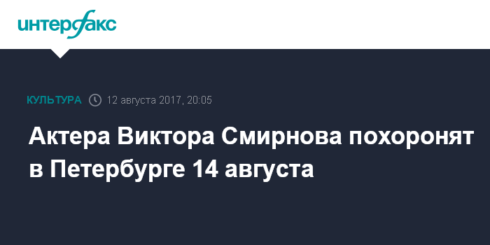 "Виктор Фёдорович Смирнов будет похоронен 14 августа на Серафимовском кладбище. Прощание в Александринском театре начнется в 11 часов. Отпевание в Храме преподобного Серафима Саровского на Серафимовском кладбище в 13 часов, церемония захоронения в 14 часов", - сообщила пресс-служба Александринского театра, где работал артист.