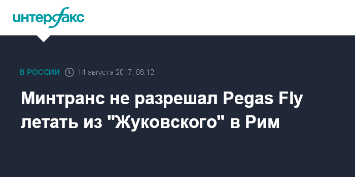 Москва. 14 августа. INTERFAX.RU - Межведомственная комиссия при Минтрансе РФ отказала авиакомпании Pegas Fly (юридическое название - "Икар") в допуске на регулярные рейсы из подмосковного аэропорта "Жуковский" в Рим.