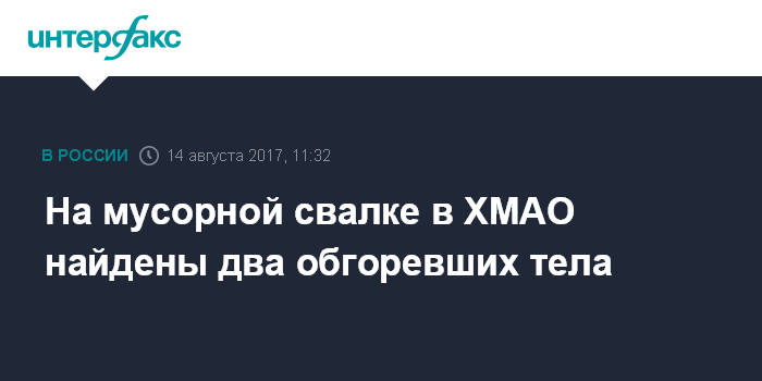 Москва. 14 августа. INTERFAX.RU - Обгоревшие тела мужчины и женщины найдены на свалке около Нижневартовска (Ханты-Мансийский автономный округ), сообщается на сайте регионального управления СКР в понедельник.