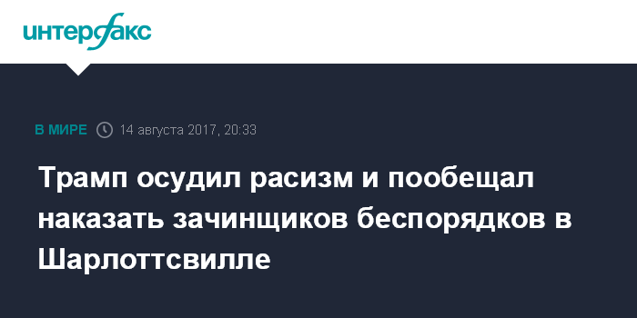 Москва. 14 августа. INTERFAX.RU - Президент США Дональд Трамп пообещал привлечь к ответственности всех виновных в столкновениях в ходе демонстрации, состоявшейся в городе Шарлоттсвилле на минувших выходных.