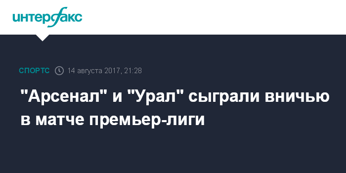 Москва. 14 августа. INTERFAX.RU - Матч шестого тура чемпионата России по футболу "Арсенал" (Тула) – "Урал" (Екатеринбург) завершился вничью.