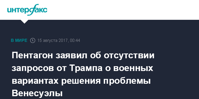 Москва. 15 августа. INTERFAX.RU - Белый дом не запрашивал у Пентагона варианты военного решения венесуэльского кризиса, заявил в понедельник представитель оборонного ведомства США Роб Мэннинг.