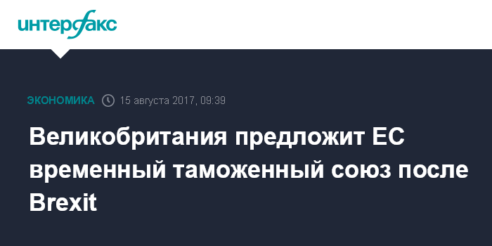 Москва. 15 августа. INTERFAX.RU - Великобритания предложит Европейскому союзу "временный таможенный союз" на переходный период после Brexit, говорится в документе с изложением позиции правительства, который будет официально опубликован во вторник.