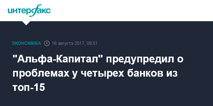 Москва. 16 августа. INTERFAX.RU - Управляющая компания "Альфа-Капитал" направила своим клиентам письмо, в котором предупредила о возможных проблемах у четырех российских банков, входящих в топ-15 по стране: ФК "Открытие", Бинбанка, Промсвязьбанка и Московского кредитного банка (МКБ), сообщает в среду газета "Ведомости" со ссылкой на текст этого письма.