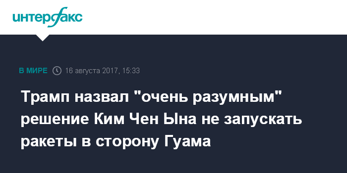 Москва. 16 августа. INTERFAX.RU - Президент США Дональд Трамп на своей странице в "Твиттере" дал положительную оценку решению лидера КНДР Ким Чен Ына воздержаться от пуска ракет в район острова Гуам - владения США.