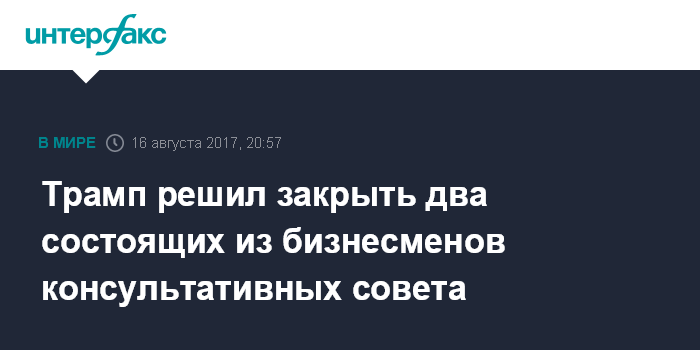 Москва. 16 августа. INTERFAX.RU - Президент США Дональд Трамп заявил в среду, что решил прекратить работу при его администрации двух состоящих из бизнесменов консультативных советов.