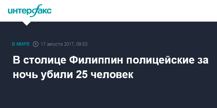 Москва. 17 августа. INTERFAX.RU - Силы безопасности Филиппин в ночь на четверг убили в Маниле 25 человек, в том числе 14 - в ходе массовых антинаркотических рейдов, сообщает сингапурский телеканал Channel NewsAsia со ссылкой на филиппинскую полицию.