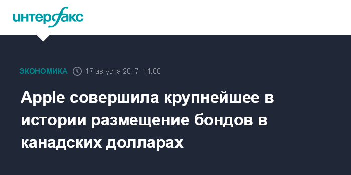 Москва. 17 августа. INTERFAX.RU - Apple впервые разместила бонды в канадских долларах, сразу установив рекорд для размещения облигаций в этой валюте.
