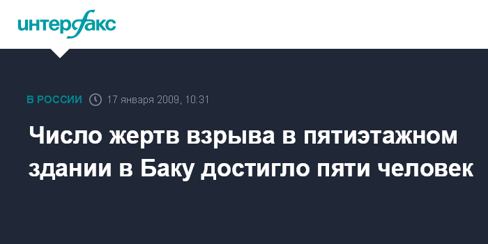 Баку. 17 января. INTERFAX.RU - В результате взрыва в пятиэтажном жилом доме в Баку в минувшую пятницу погибло пять человек, передает телеканал AzTv в субботу.
