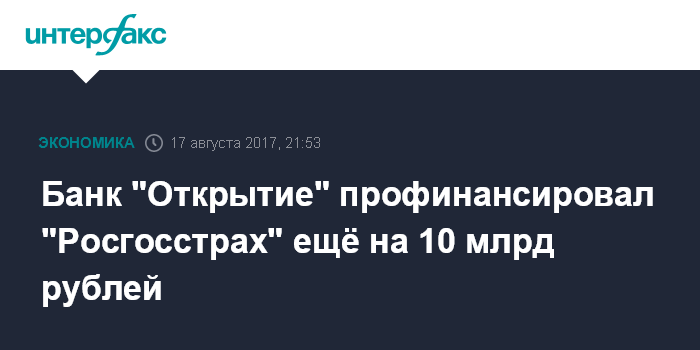 Москва. 17 августа. INTERFAX.RU - Банк "Открытие" в июле предоставил "Росгосстраху" дополнительное финансирование в размере 10 млрд рублей, говорится в сообщении рейтингового агентства S&P.