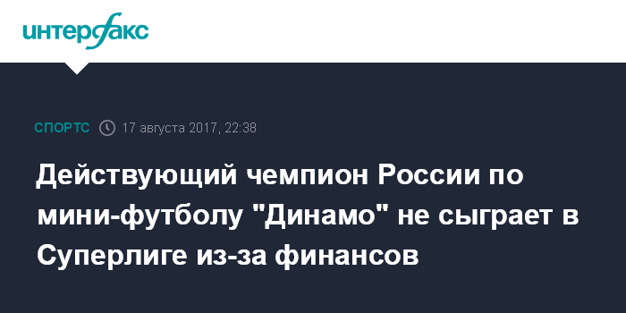 Москва. 17 августа. INTERFAX.RU - Действующий чемпион России, 11 кратный чемпион страны по мини-футболу московское "Динамо" официально сообщило о том, что не будет выступать в Суперлиге в сезоне-2017/18.