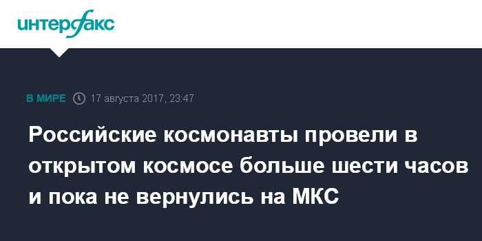 Как сообщалось, космонавты вышли в открытый космос в 17:42 мск и планировали вернуться на станцию через шесть часов.