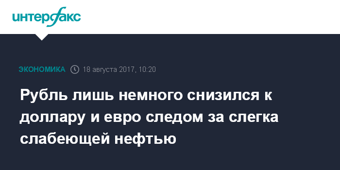 Как отмечают эксперты "Интерфакс-ЦЭА", рубль немного понижается к бивалютной корзине на фоне слегка дешевеющей нефти после первого за четыре сессии подъема накануне. Стоимость октябрьских фьючерсов на нефть Brent на лондонской бирже ICE Futures к 10:01 МСК в пятницу опустилась на 0,04% - до $51,01 за баррель. Цена фьючерса на нефть WTI на октябрь на электронных торгах Нью-йоркской товарной биржи (NYMEX) уменьшилась к этому времени на 0,11% - до $47,19 за баррель.
