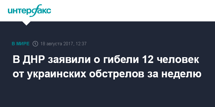 Москва. 18 августа. INTERFAX.RU - Двенадцать человек погибли и еще шесть получили ранения за неделю в результате обстрелов территории самопровозглашенной Донецкой народной республики со стороны украинских военных, заявил на брифинге заместитель командующего оперативным командованием ДНР Эдуард Басурин.