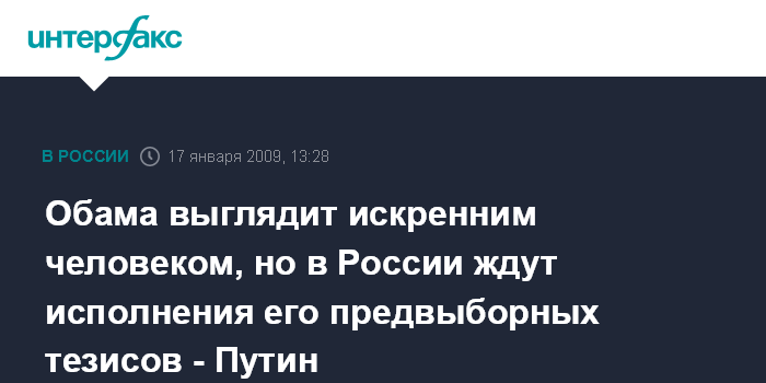 Обама выглядит искренним человеком, но в России ждут исполнения его предвыборных тезисов - Путин